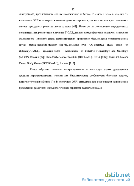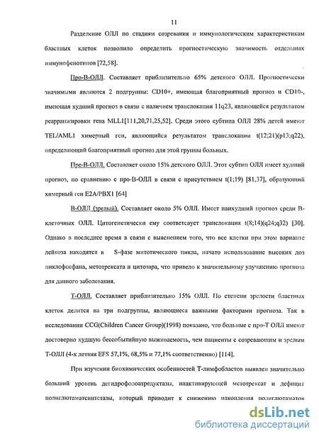 Имеются исследования по изучению взаимосвязи полиморфизма генов интерлейкина-10, и ответа на преднизолон, показавшие ассоциацию генотипа IL-10GIG с плохим ответом на преднизолон [39,47]. По данным анализа терапии ОЛЛ у детей в России в рамках проспективного многоцентрового исследования ALL-BFM-90\ALL-MB-91 показано, что главным фактором, определяющим долгосрочный прогноз на протоколе ALL-MB-91, является достижение ремиссии к 33\36 дню, а не качество раннего ответа на 8 и 15 день индукции [89]. Таким образом, хороший ранний ответ на терапию является отражением скорости редукции опухолевого клона и может позволить выделить группу пациентов, которым возможно уменьшить интенсивность полихимиотерапии. Минимальная резидуальная болезнь отражает наличие бластных клеток в костном мозге у пациентов в ремиссии. Исследование минимальной резидуальной болезни возможно с использованием методов классической цитогенетики, что позволяет выявить 1 бластную клетку на 100 нормальных клеток. Проведение этого исследования методом проточной цитометрии позволяет отличить фенотип бластной клетки от нормальной гематопоэтической с чувствительностью 10"4-10"5 [31]. Во многих исследованиях в настоящее время оценивается MRD-ответ [115,116,24,32,33,65,16,73]. По данным группы BFM, наиболее важным для определения клинических групп риска является оценка MRD на 33 день терапии и на 12 неделе. Дети с персистенцией заболевания ( 1бласта\мкл) имеют 100% вероятность рецидива против 6% у остальной группы пациентов [68]. Таким образом, благодаря определению минимальной резидуальной болезни стало возможным улучшение результатов лечения больных с ОЛЛ за счет перераспределения больных в группах риска. Однако, в настоящее время использование этого метода в условиях России практически не возможно.