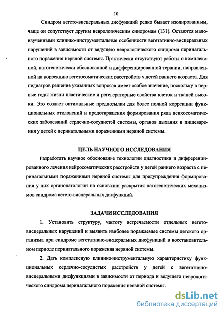 Разработать научное обоснование технологии диагностики и дифференцированного лечения неиросоматических расстройств у детей раннего возраста с перинатальными поражениями нервной системы для предупреждения формирования у них органопатологии на основании раскрытия патогенетических механизмов синдрома вегето-висцеральных дисфункций.