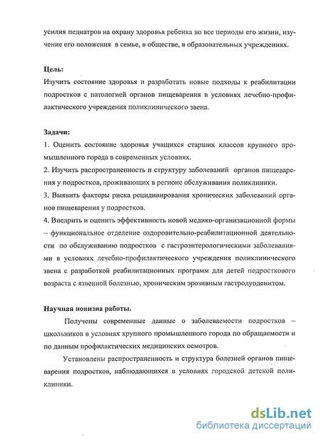 Изучить состояние здоровья и разработать новые подходы к реабилитации подростков с патологией органов пищеварения в условиях лечебно-профилактического учреждения поликлинического звена.