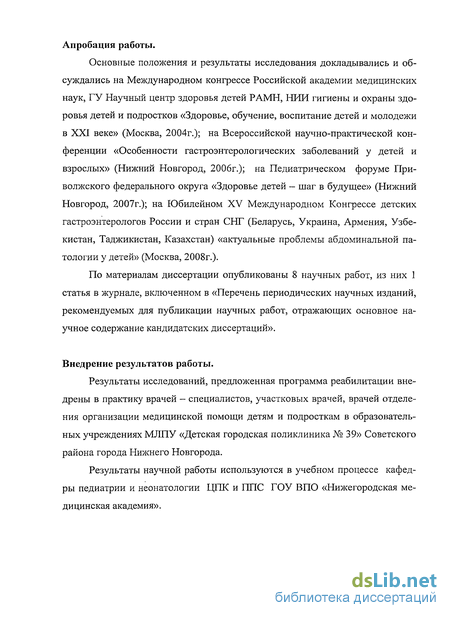 Основные положения и результаты исследования докладывались и обсуждались на Международном конгрессе Российской академии медицинских наук, ГУ Научный центр здоровья детей РАМН, НИИ гигиены и охраны здоровья детей и подростков «Здоровье, обучение, воспитание детей и молодежи в XXI веке» (Москва, 2004г.); на Всероссийской научно-практической конференции «Особенности гастроэнтерологических заболеваний у детей и взрослых» (Нижний Новгород, 2006г.); на Педиатрическом форуме Приволжского федерального округа «Здоровье детей — шаг в будущее» (Нижний Новгород, 2007г.); на Юбилейном XV Международном Конгрессе детских гастроэнтерологов России и стран СНГ (Беларусь, Украина, Армения, Узбекистан, Таджикистан, Казахстан) «актуальные проблемы абдоминальной патологии у детей» (Москва, 2008г.).