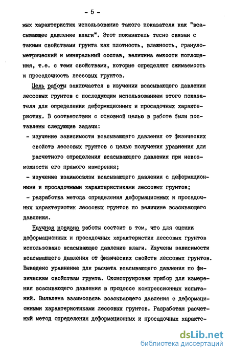 Научная новизна работы состоит в том, что для оценки деформационных и просадочных характеристик лессовых грунтов использовано всасывающее давление влаги. Изучены зависимости всасывающего давления от физических свойств лессовых грунтов. Выведено уравнение для расчета всасывающего давления по физическим свойствам грунта. Сконструирован прибор для измерения всасывающего давления в процессе компрессионных испытаний. Выявлена взаимосвязь всасывающего давления с деформационными характеристиками лессовых грунтов. Разработан расчетный метод определения деформационных и просадочных характе-