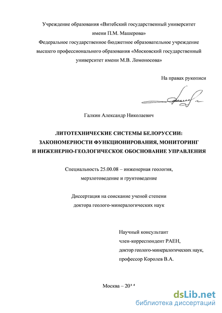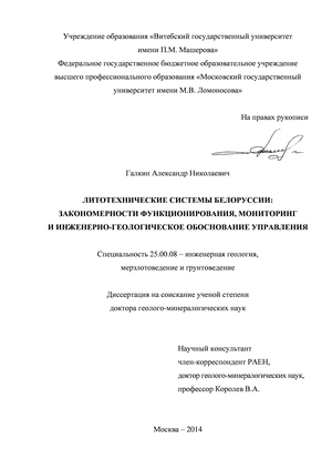 Благодарности. Автор выражает глубокую признательность своему научному консультанту, д.г.-м.н., член-корр. РАЕН, профессору В.А. Королеву за постановку темы диссертационных исследований и всестороннюю поддержку в их выполнении; д.г.-м.н., доценту В.Г. Жогло за плодотворные консультации при выполнении диссертационных исследований; д.г.-м.н., акад. НАН Беларуси, профессору А.В. Матвееву за консультации и предоставление тематического картографического материала; к.г.-м.н., доценту И.А. Красовской и А.Ф. Акулевичу за оказанную поддержку и советы на всех этапах выполнения работы.