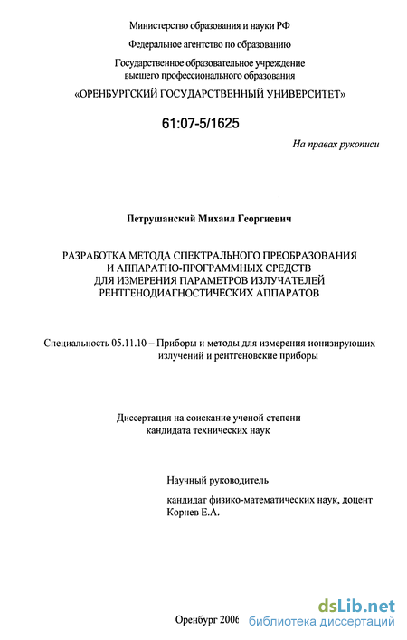 В диссертации представлены исследования, выполненные автором в Оренбургском государственном университете. Основные результаты этих исследований опубликованы в работах [1-17]. Проведенный цикл работ посвящен разработке метода спектрального преобразования и средств для определения суммарной фильтрации пучка рентгеновского излучения, слоя половинного ослабления и анодного напряжения рентгеновских диагностических аппаратов.