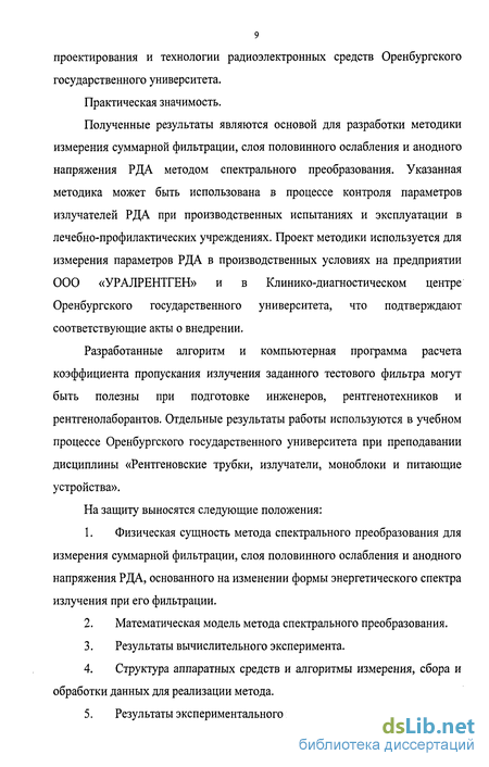Полученные результаты являются основой для разработки методики измерения суммарной фильтрации, слоя половинного ослабления и анодного напряжения РДА методом спектрального преобразования. Указанная методика может быть использована в процессе контроля параметров излучателей РДА при производственных испытаниях и эксплуатации в лечебно-профилактических учреждениях. Проект методики используется для измерения параметров РДА в производственных условиях на предприятии ООО «УРАЛРЕНТГЕН» и в Клинико-диагностическом центре Оренбургского государственного университета, что подтверждают соответствующие акты о внедрении.
