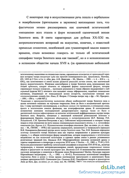 «Для деятелей театра, - пишет В.Е. Хализев - важно приближение (пусть относительное) к полноте воссоздания драматургии в спектакле. Режиссер и актеры призваны постигнуть и донести до зрителей ведущие смысловые мотивы (курсив М.С.) поставленного произведения». (Хализев В.Е. Драматическое произведение и некоторые особенности его изучения. Анализ драматического произведения. Межвузовский сборник. Под ред. проф. В.М. Морозова. — Л., Изд-во ЛГУ. - 1988. - с. 23). 2 Бальян К.Ю. Театральная специфика «драм о святых» и становление барокко на испанской сцене (дис. на соиск. уч. ст. канд. иск.). - М., РАТИ. — 1999: Отметим, что «семантика» театра Золотого века, миметические и социально значимые аспекты в его эстетике освещались в работах А.Л. Штейна (см. Штейн А.Л. История испанской литературы. — М., Наука. — 2001. — 608 с), Н.И. Балашова (см. Балашов Н.И. Испанская классическая драма в сравнительно-литературном и текстологическом аспектах. — M., Наука. — 1975. — 335с), М.Л. Андреевым, (см. Андреев. М.Л. Итальянское Возрождение: от стиля к жанру. // Историческая поэтика. Литературные эпохи и типы художественного сознания. - М., Наследие. - 1994. - с. 297-325).
