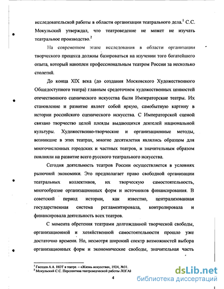 Значительную роль в создании эстетических ценностей сценического искусства играют формы и методы организации творческого процесса. О комплексности театрального искусства неоднократно говорили выдающиеся деятели русской культуры. О взаимосвязях творческих и организационных аспектов театра писал А.Н. Островский. Как сложную целостную систему рассматривал театр К. С. Станиславский и В л. И. Немирович - Данченко. Вс. Э. Мейерхольд, А.Я. Таиров и другие ведущие отечественные режиссеры неоднократно подчеркивали важность организационных проблем театрального дела, от правильности и своевременности решения которых во многом зависит художественный уровень спектаклей. Исследования в этой области представляются сегодня не менее важными, чем изучение художественно-творческих сторон деятельности театральных коллективов.