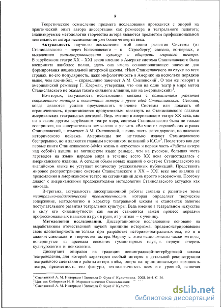Разумеется, осмысление проблематики диссертации было невозможно без привлечения значительного числа трудов по истории развития системы Станиславского и истории американского театра на русском и английском языках.