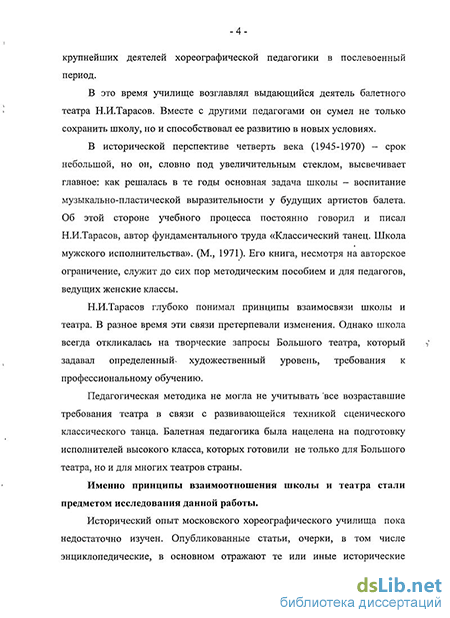 Большой вклад в развитие отечественной балетной педагогики внес выдающийся педагог и теоретик балетного искусства Н.И.Тарасов. Он и А.Ваганова разработали уникальную методику профессионального обучения, получившую широкое признание во многих странах мира.
