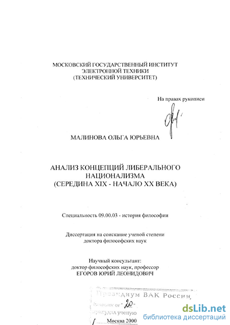 Малинова Ольга Юрьевна. Анализ концепций либерального национализма, середина ХIХ - начало ХХ века : диссертация ... доктора философских наук : 09.00.03.- Москва, 2000.- 275 с.: ил. РГБ ОД, 71 01-9/94-7