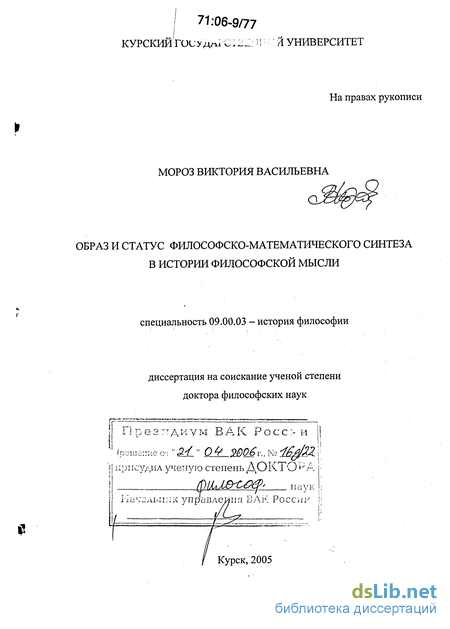 Целью настоящего исследования является раскрытие образа и определение статуса философско-математического синтеза в истории философской мысли. Под образом понимается специфический вид теоретизирования, не совпадающий ни с понятием, ни с концепцией. Это некоторое представление, связанное с наглядными конструкциями. В контексте диссертации образ философско-математического синтеза - вид знания, обладающий наглядной целостностью и формирующийся на основе реконструкции разновидностей исследуемого феномена в истории философской мысли. Под статусом философско-математического синтеза понимается его место в духовной культуре, связь с другими формами философско-математического взаимодействия, а также с родственными процессами, происходящими в различный сферах духовной деятельности, в частности, налаживанием диалога между различными