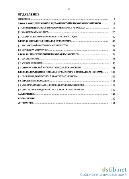 Реализация общеметодологического подхода, изложенного выше, определила структуру исследования, выразилась в последовательности глав и взаимосвязи их содержания. В Главе I решается задача выявления основной проблемы и концептуального ядра философии Кузанского. Глава II посвящена реконструкции онтологии, а Глава III посвящена объяснению особенностей эпистемологии Кузанского, а также синтезу онтологии и эпистемологии в специфическом «онтологическом аргументе». Диалектика Кузанского рассматривается на протяжении первых трех глав, в Главе IV ее особенности раскрываются детально на материале трактата «О неином».