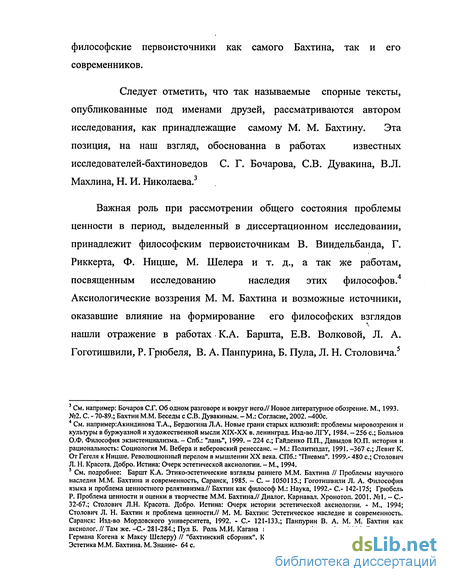 Количество комментариев и исследований бахтинского наследия довольно обширно, но нужно отметить, что в настоящее время практически нет работ, которые бы были посвящены отдельному рассмотрению проблемы ценности в философии М. М. Бахтина. Количество исследований посвященных именно проблеме "ценности" и "оценки" как отдельной, самостоятельной части бахтинской философии можно пересчитать по пальцам, а если и происходит обращение к интересующему нас вопросу, то он как правило включен в общий контекст исследований работ М. М. Бахтина. В данной работе не рассматривается огромный пласт литературы, посвященной философии М. М. Бахтина, так как она не отвечает поставленным целям и задачам в исследовании ценностной проблематики, присущей бахтинской философии. Поэтому анализ использованных при написании диссертации источников в известном смысле односторонен или, как сказал бы сам М. М. Бахтин - "монологичен". Эта односторонность осознается и представляется в современной ситуации с Бахтиным оправданной. Основной упор в исследовании делается на