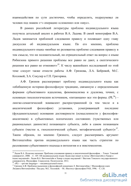 индивидуального языка «вообще не релевантна проблеме следования правилу в том смысле, что ни положительный, ни отрицательный ответ на вопрос о языке Робинзона прямого решения проблемы все равно не дают, а скептического решения все равно не отменяют»15. К числу важнейших исследований по этой теме следует также отнести работы А.Ф. Грязнова, Л.А. Бобровой, М.С. Козловой, З.А. Сокулер и Г.П. Григоряна. Значительный вклад в русскоязычную