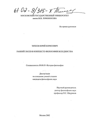 Тихеев Юрий Борисович. Ранний Лосев в контексте философии всеединства : диссертация ... кандидата философских наук : 09.00.03.- Москва, 2002.- 140 с.: ил. РГБ ОД, 61 02-9/315-X