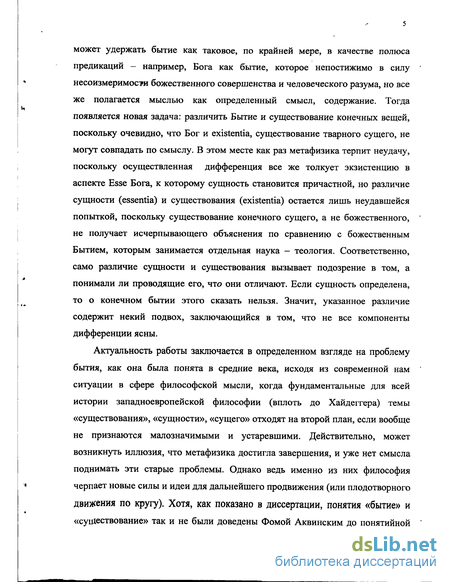 внятности, тем не менее, незавершенность работы Аквината и более поздних схоластов не может свидетельствовать о принципиальной неразрешимости и бессодержательности темы бытия. Исследование стремится показать, что к вопросу существования не следует подходить с мерками классической логики и метафизики, а именно: познание не всегда связано с предикативной деятельностью разума (познать нечто - это значит: дать определение), но существуют иные, допредикативные виды знания, в которых бытие постижимо. Тогда, схоластические разработки средних веков демонстрируют определенный уровень понимания вопроса, дальше которого средневековая философская школа двинуться просто не могла, но с которого можно начинать дальнейшее движение нам. Что, кстати, видно уже у Уильяма Оккама, но по некоторым причинам не было поддержано и артикулировано другими. Наиболее плодотворную разработку вопроса мы встречаем у Хайдеггера, правда, в связи с несколько иной проблемой - вопросом онтологической дифференции. Однако именно тут Хайдеггер предлагает очень существенные идеи для подхода к интересующей нас теме, хотя непосредственно анализом хайдеггерианского различия между сущим и бытием мы не занимаемся.