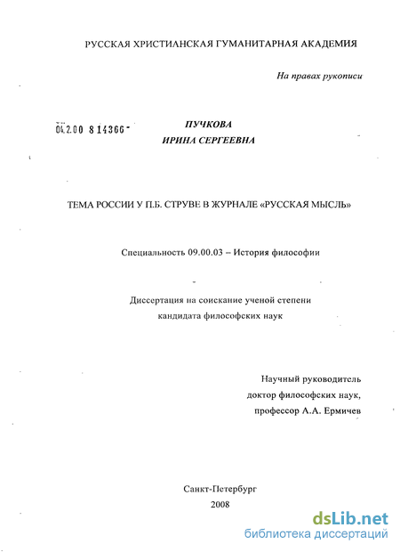 Актуальность темы исследования. Тема России и ее судьбы, тема русского самосознания всегда стояли в центре интересов нашей философии. Более того, можно утверждать, что в полноте своих проблем русская философия была «организована» этими вопросами. В XIX веке эта проблематика была задана любомудрами и П.Я. Чаадаевым, спорами славянофилов и западников и с новой остротой встала в начале XX века, когда страна снова оказалась в ситуации выбора исторического пути. В творческом наследии общественного деятеля, политического мыслителя, экономиста и философа Петра Бернгардовича Струве (1870-1944) тема России занимает центральное место. Целостной концепции России (как это, например, потом предложили евразийцы) он не создавал и, кажется, не стремился к этому. Однако в написанных П.Б. Струве газетных и журнальных статьях, специальных экономических и исторических исследованиях, литературно-критических выступлениях и сотнях различных рецензий выявляется комплекс основных идей, которыми он руководился при своих размышлениях о России. Эти идеи отразились в каждом из начинаний и каждое из них имело всегда определенную, то ближе, то дальше поставленную цель. Этой целью было осмысление настоящего России и ее процветание, когда в условиях политической и экономической^ свободы достигается максимум гармонии между личностью и обществом.