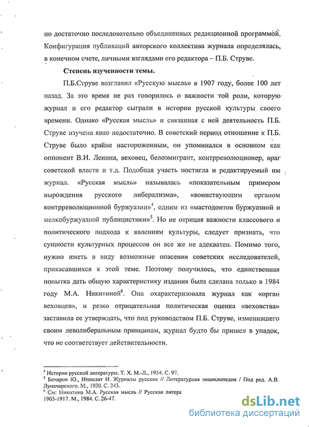 П.Б.Струве возглавил «Русскую мысль» в 1907 году, более 100 лет назад. За это время не раз говорилось о важности той роли, которую-журнал и его редактор сыграли в истории русской культуры своего времени. Однако «Русская мысль» и связанная с ней деятельность П.Б. Струве изучена явно недостаточно. В советский- период отношение к П.Б. Струве было крайне настороженным, он упоминался в основном как оппонент В.И. Ленина, веховец, белоэмигрант, контрреволюционер, враг советской власти и т.д. Подобная участь постигла и редактируемый им-журнал. «Русская мысль» называлась «показательным примером вырождения русского либерализма», «воинствующим органом контрреволюционной буржуазии»4, одним из «мастодонтов буржуазной и мелкобуржуазной публицистики» . Но не отрицая важности классового и политического подхода к явлениям культуры, следует признать, что сущности культурных процессов он все же не адекватен. Помимо того, нужно иметь в виду возможные опасения советских исследователей, прикасавшихся к этой теме. Поэтому получилось, что единственная попытка дать общую характеристику издания была сделана только в 1984 году М.А. Никитиной . Она охарактеризовала журнал как «орган веховцев», и резко отрицательная политическая оценка «веховства» заставила ее утверждать, что под руководством П.Б. Струве, изменившего своим леволиберальнымг принципам, журнал будто бы пришел в упадок, что не соответствует действительности.