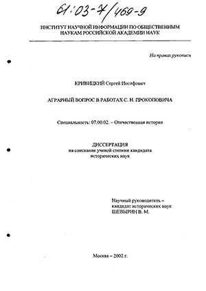 Кривицкий Сергей Иосифович. Аграрный вопрос в работах С. Н. Прокоповича : диссертация ... кандидата исторических наук : 07.00.02.- Москва, 2002.- 261 с.: ил. РГБ ОД, 61 03-7/469-9
