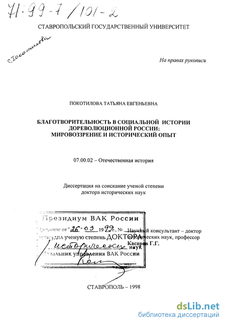 Апробация исследования. Научные результаты диссертации послужили темой для обсуждения на заседании круглого стола Министерства труда и социальной защиты населения Правительства Ставропольского края. Основные выводы и положения исследования изложены и обсуждены на международных конференциях "Цивилизационный и формационный подходы к изучению отечественной истории: теория и методология" (Москва, 1995); "Царизм и российское общество в начале XX века: новые подходы и задачи