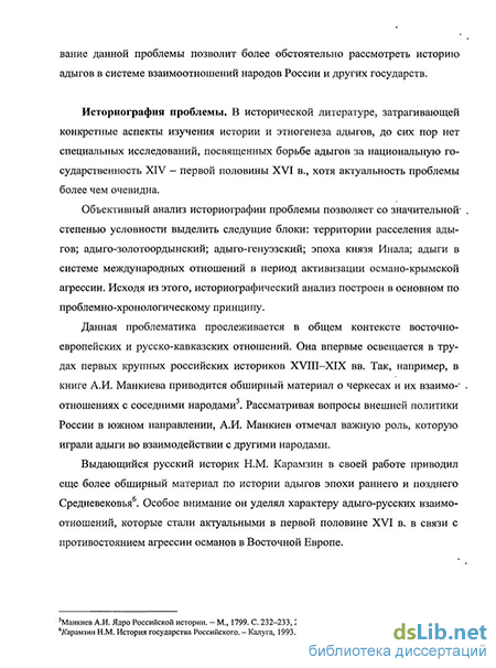 Данная проблематика прослеживается в общем контексте восточноевропейских, русско-кавказских отношений. Она впервые освещается в трудах первых крупных российских историков XVIII–XIX вв. В труде А.И. Манкиева приводится обширный материал о черкесах и их взаимоотношениях с соседними народами . Рассматривая вопросы внешней политики России в южном направлении А.И. Манкиев отмечает важную роль, которую играли адыги во взаимодействии с другими народами.
