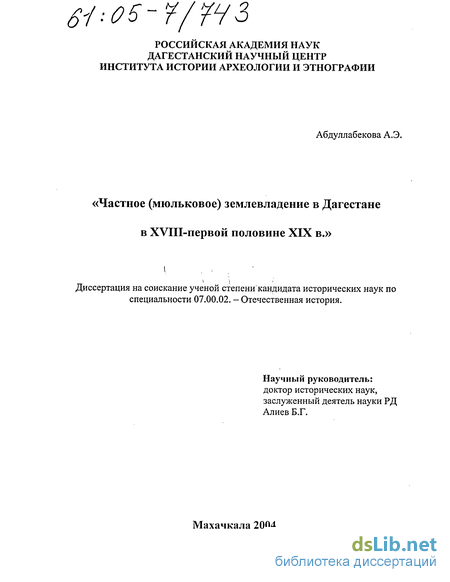 Из приведенного материала, перечня анализируемых работ видно, что исследователи и досоветского, и постсоветского периодов уделяли значительное внимание земельно-правовым отношениям в Дагестане вообще, формам земельной собственности и в частности мюльковому землевладению различных периодов истории, в том числе по изучаемому периоду. Вместе с тем отметим также, что все еще в отечественной историографии нет обобщающей монографической работы по XVIII-нач. XIX в. с охватом всех особенностей мюлька, которые проявлялись в том или ином владении, в том или ином регионе Дагестана.