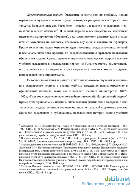 Дореволюционный период. Отдельные аспекты данной проблемы нашли отражение в фундаментальных трудах, в которых раскрывается история строительства вооруженных сил Российской империи1, а также в справочных и энциклопедических изданиях2. В данный период в военно-учебных заведениях издавались сборники 3 , в которых имеются аналитические и справочные материалы по вопросам правового обучения и воспитания офицеров. Кроме того, в них нашли отражение идеи известных государственных деятелей и военачальников того времени по совершенствованию правовой подготовки офицерских кадров. Однако правовая подготовка офицерских кадров в военно-учебных заведениях в исследуемый период не была предметом самостоятельного изучения в этих изданиях и рассматривалась только в контексте других вопросов военного строительства.