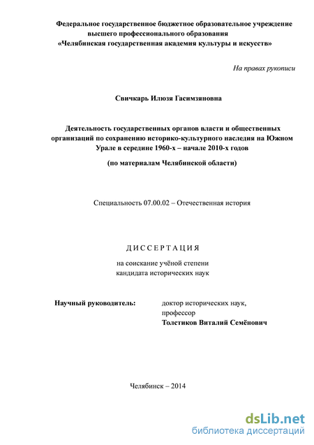 В Челябинской области структура государственного управления охраной культурного наследия была построена по общегосударственному принципу, имея ряд особенностей, о чём речь пойдёт ниже. Кризисным периодом в советской памятникоохранительной системе стали годы правления Н.С. Хрущёва, когда проявилось небрежное отношение к историческому прошлому, выражавшееся в неоправданном сносе и разрушении архитектурных и археологических памятников в ходе новостроек, наступлении очередного витка сноса и закрытия культовых зданий, многие из которых являлись памятниками архитектуры. Во второй половине 1950-х — начале 1960-х годов были урезаны ассигнования на охрану и реставрацию памятников, значительно сократился сам список памятников, стоящих под государственной охраной. Началом нового этапа в деятельности по охране и пропаганде памятников истории и культуры можно считать 1966 год, когда было принято постановление Совета Министров Российской Федерации «О состоянии и мерах улучшения охраны памятников истории и культуры в РСФСР»91. По этому постановлению в целях совершенствования работы по учёту, реставрации и использованию недвижимых памятников истории и культуры в Министерстве культуры РСФСР была образована Государственная инспекция по охране памятников истории и культуры. В органах культуры областного звена была предусмотрена организация местных инспекций. Однако на практике в них ввели лишь должности инспекторов по охране памятников, в помощь которым с начала 1970-х годов в отдельных регионах стали создаваться хозрасчётные производственные группы по охране и эксплуатации памятников. Таким образом, в республике была создана специализированная государственная система органов по охране, использованию и пропаганде недвижимых памятников с центральным органом и местным аппаратом. В системе имелась сеть реставрационных организаций, а также научно-методический центр, которым стал вновь образованный научно-исследовательский институт музееведения и охраны памятников Министерства культуры РСФСР92. Кроме того, в научно-методических вопросах республиканская система могла опираться на разработки союзных отраслевых научно-методических и научно-практических центров93 и на институты системы АН СССР94. В деятельности государственных органов по охране и пропаганде памятников истории и культуры за период 1960-х – 1980-х годов произошли существенные сдвиги, среди которых следует отметить появление первых в истории нашей страны общегосударственных законодательных актов о защите культурного наследия – Закона СССР 1976 года и Закона РСФСР 1978 года «Об охране и использовании памятников истории и культуры». Важное значение имело вхождение Советского Союза в международную систему охраны культурного наследия, а также рост общественных инициатив и возрождение в 1960-е годы общественных форм содействия государственным органам охраны памятников; формирование региональной памятникоохранительной системы, базировавшейся на прочном союзе с местными отделениями Всероссийского общества охраны памятников истории и культуры, поисковым движением, студенческими реставрационными отрядами и другими общественными организациями; развитие и централизация реставрационного дела; проведение ряда крупных научно-исследовательских, организационных, 