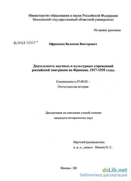 Актуальность темы исследования. Конец XX - начало XXI века в отечественной истории принято называть переходным периодом или этапом становления современной российской государственности. Распад Советского Союза, возникновение на его месте более десятка суверенных государств, социально-экономические и политические потрясения в каждом из них, появление многомиллионной массы русских людей, оказавшихся за пределами родины, выстраивание новой концепции международных отношений в ракурсе последних изменений - таковы исторические реалии на постсоветском пространстве в конце XX — начале XXI века. Аналогичные события происходили в российской и мировой истории в первой трети XX века, ознаменовавшейся исчезновением Российской империи вследствие революции 1917 года и последовавшей за ней гражданской войной. Около двух миллионов российских граждан вынуждены были покинуть пределы своей родины и, расселившись по всему миру, создали уникальное по своим масштабам и влиянию на мировой исторический процесс явление под названием «российская эмиграция первой волны» или «русское зарубежье». Значительную часть этой массовой эмиграции составляла научная и творческая интеллигенция, а основными центрами рассеяния стали Париж, Берлин, Прага, Белград и Харбин. Одна из самых многочисленных русских диаспор за рубежом в межвоенный период возникла во Франции. Особенностью пребывания российской эмиграции «первой волны» в этой стране, которая в середине 1920-х годов стала политическим и культурным центром всего русского зарубежья, является широкое многообразие деятельности отечественных учреждений практически во всех сферах образования, науки и культуры, которое составляет богатейший опыт актуальный сегодня по нескольким аспектам. Во-первых, он представляет особую ценность для многомиллионной массы русских людей, оказавшихся после распада СССР фактически в том же положении, что и российские эмигранты первой трети XX века. Они также вынуждены противостоять