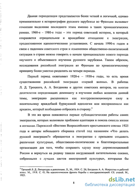 Первый период охватывает 1920-е - 1930-е годы, то есть время существования российской эмиграции «первой волны». В- работах Л. Д. Троцкого, А. А. Богданова и других советских авторов, на многие десятилетия определивших доминанту в изучении любых аспектов данной темы, эмиграцию расценивали как контрреволюционную силу и носительницу враждебной буржуазной идеологии или воспринимали как архаизм, который необходимо отбросить в сторону.3