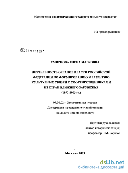 Хронологические рамки исследования охватывают новейший период истории развития культурных связей с соотечественниками из ближнего зарубежья в 1992-2003 гг. Выбор нижних хронологических рамок исследования определяется распадом СССР, в результате которого