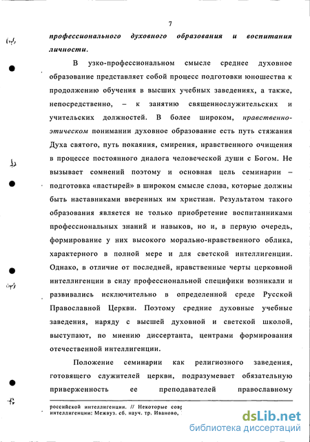 В узко-профессиональном смысле среднее духовное образование представляет собой процесс подготовки юношества к продолжению обучения в высших учебных заведениях, а также, непосредственно, - к занятию священнослужительских и учительских должностей. В более широком, нравственно-этическом понимании духовное образование есть путь стяжания Духа святого, путь покаяния, смирения, нравственного очищения в процессе постоянного диалога человеческой души с Богом. Не вызывает сомнений поэтому и основная цель семинарии -подготовка «пастырей» в широком смысле слова, которые должны быть наставниками вверенных им христиан. Результатом такого образования является не только приобретение воспитанниками профессиональных знаний и навыков, но и, в первую очередь, формирование у них высокого морально-нравственного облика, характерного в полной мере и для светской интеллигенции. Однако, в отличие от последней, нравственные черты церковной интеллигенции в силу профессиональной специфики возникали и развивались исключительно в определенной среде Русской Православной Церкви. Поэтому средние духовные учебные заведения, наряду с высшей духовной и светской школой, выступают, по мнению диссертанта, центрами формирования отечественной интеллигенции.