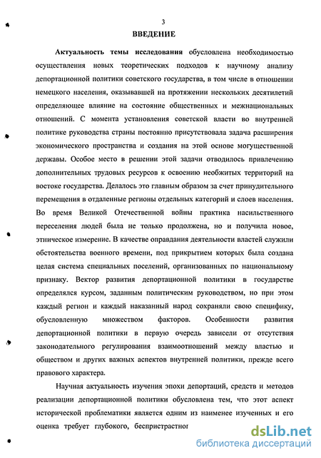 Актуальность темы исследования обусловлена необходимостью осуществления новых теоретических подходов к научному анализу депортационной политики советского государства, в том числе в отношении немецкого населения, оказывавшей на протяжении нескольких десятилетий определяющее влияние на состояние общественных и межнациональных отношений. С момента установления советской власти во внутренней политике руководства страны постоянно присутствовала задача расширения экономического пространства и создания на этой основе могущественной державы. Особое место в решении этой задачи отводилось привлечению дополнительных трудовых ресурсов к освоению необжитых территорий на востоке государства. Делалось это главным образом за счет принудительного перемещения в отдаленные регионы отдельных категорий и слоев населения. Во время Великой Отечественной войны практика насильственного переселения людей была не только продолжена, но и получила новое, этническое измерение. В качестве оправдания деятельности властей служили обстоятельства военного времени, под прикрытием которых была создана целая система специальных поселений, организованных по национальному признаку. Вектор развития депортационной политики в государстве определялся курсом, заданным политическим руководством, но при этом каждый регион и каждый наказанный народ сохраняли свою специфику, обусловленную множеством факторов. Особенности развития депортационной политики в первую очередь зависели от отсутствия законодательного регулирования взаимоотношений между властью и обществом и других важных аспектов внутренней политики, прежде всего правового характера.