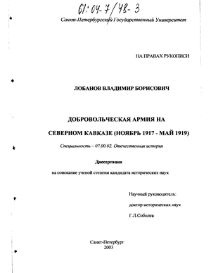 Апробация работы. Диссертация подготовлена на кафедре Истории России и зарубежных стран РГИ-ИГШК СПбГУ. Автор выступал с сообщениями по теме диссертации на конференциях «Общество и власть», состоявшихся в Санкт-Петербургском университете в 2001 и 2002 гг. В межвузовском сборнике «Общество и власть» за 2001 и 2003 гг. опубликованы две статьи: 1) Власть, общество и оппозиция на юге России во время Гражданской войны; 2) Ледяной поход: Комаддующий Добровольческой армии генерал Л.Г.Корнилов глазами белогвардейцев.