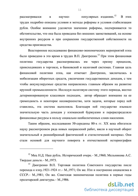Всестороннее исследование финансово-экономических мероприятий нэпа было проведено в это время в трудах В.П. Дмитренко. При этом финансовая политика государства рассматривалась им через призму процессов, происходивших в торговле, в банковской и налоговой системах. Главная цель финансовой политики нэпа, как отмечает Дмитренко, заключалась в мобилизации оборотных средств, увеличении государственных доходов, с тем чтобы аккумулируемые средства направлялись главным образом на развитие крупной промышленности. Исследуя налоговую систему этого периода, жестко детерминированную классовым подходом, автор обращает внимание на ее громоздкость и некоторое несовершенство, хотя задачи, которые перед ней ставились, эта система выполняла. Благодаря ней государство изымало значительную часть доходов у нэпманской буржуазии и перераспределяло финансовые ресурсы в пользу социально необеспеченных слоев населения.