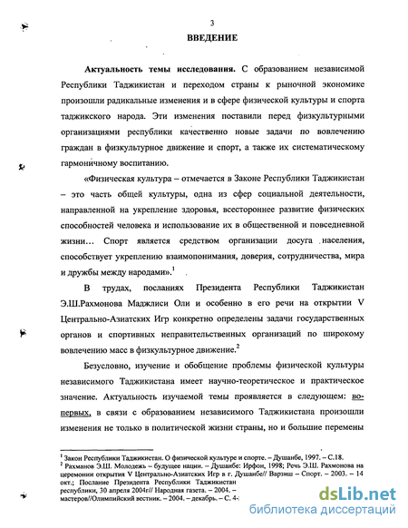 4 в сфере физической культуры и спорта; во-вторых, изучение, обобщение и освещение форм, методов и специфических особенностей развития физкультурного движения в новых исторических условиях будет способствовать повышению роли государственных структур, а также неправительственных организаций дальнейшему усилению физического воспитания граждан республики; в-третьих, исследование данной проблемы обусловлено и тем, что назрела необходимость разработки практических рекомендации по фактическому осуществлению, принятом Маджлиси Оли (15 мая 1997г.) Закона Республики Таджикистан «О физической культуре и спорте».