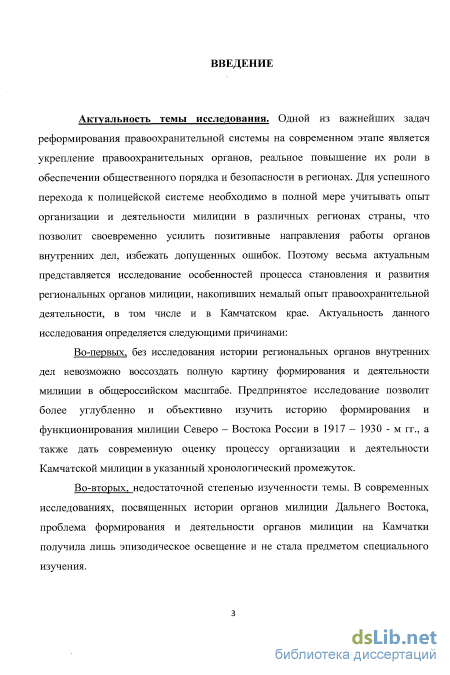 Актуальность темы исследования. Одной из важнейших задач реформирования правоохранительных системы на современном этапе является укрепление правоохранительных органов, реальное повышение их роли в обеспечении общественного порядка и безопасности в регионах. Для успешного перехода к полицейской системе необходимо в полной мере учитывать опыт организации и деятельности милиции в различных регионах страны, что позволит своевременно усилить позитивные направления работы органов внутренних дел, избежать допущенных ошибок. Поэтому весьма актуальным представляется исследование особенностей процесса становления и развития региональных органов милиции, накопивших немалый опыт правоохранительной деятельности, в том числе и в Камчатском крае. Актуальность данного исследования определяется следующими причинами: