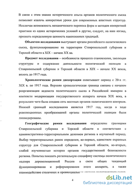 Географические рамки исследования определены границами Ставропольской губернии и Терской области в соответствии с административно-территориальным делением региона в изучаемый период. Выбор территориальных рамок определен, во-первых, единством охранных структур для Ставропольской губернии и Терской области, во-вторых, слабой изученностью истории органов государственной безопасности региона. Попытка показать региональную специфику системы политического надзора дореволюционной России в свете общих тенденций функционирования и реформирования этого аппарата, а также взаимодействие столичных и провинциальных органов политического сыска,