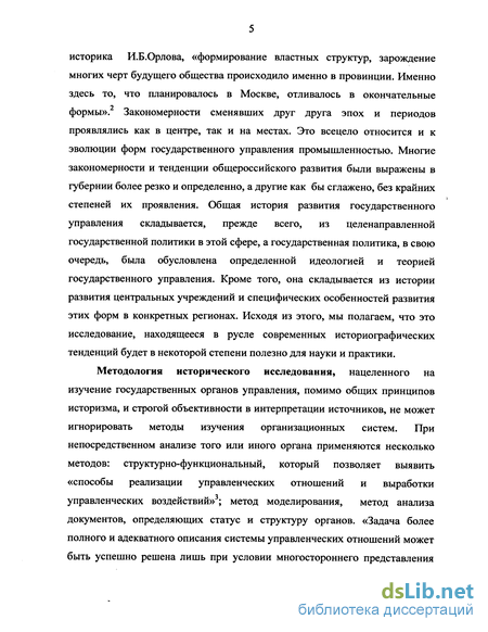 историка И.Б.Орлова, «формирование властных структур, зарождение многих черт будущего общества происходило именно в провинции. Именно здесь то, что планировалось в Москве, отливалось в окончательные формы». Закономерности сменявших друг друга эпох и периодов проявлялись как в центре, так и на местах. Это всецело относится и к эволюции форм государственного управления промышленностью. Многие закономерности и тенденции общероссийского развития были выражены в губернии более резко и определенно, а другие как бы сглажено, без крайних степеней их проявления. Общая история развития государственного управления складывается, прежде всего, из целенаправленной государственной политики в этой сфере, а государственная политика, в свою очередь, была обусловлена определенной идеологией и теорией государственного управления. Кроме того, она складывается из истории развития центральных учреждений и специфических особенностей развития этих форм в конкретных регионах. Исходя из этого, мы полагаем, что это исследование, находящееся в русле современных историографических тенденций будет в некоторой степени полезно для науки и практики.