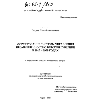 Главной целью нашего исследования является анализ становления, развития и трансформации органов управления промышленностью Вятской губернии в 1917 - 1929 годах.