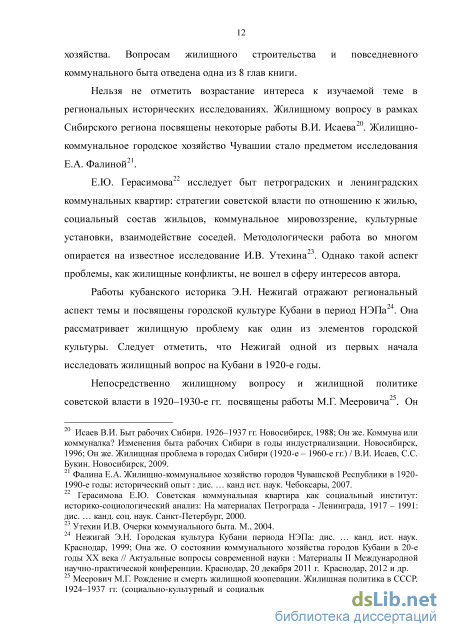 Историография «жилищного вопроса» советского периода, начиная с 1930-х гг., фрагментарна и ограничена марксистко-ленинской методологией7. Наиболее популярной темой стало жилищное обеспечение. В работах исследователей признавалось наличие самой жилищной проблемы, однако вместо ее объективного анализа жесткой критике подвергались мероприятия, ранее проводимые в этом направлении царским правительством. Характерным для публикаций этого периода было освещение тяжелых жилищных условий рабочих за границей при одновременной демонстрации позитивных изменений, произошедших в жилищной сфере благодаря действиям советской власти8.