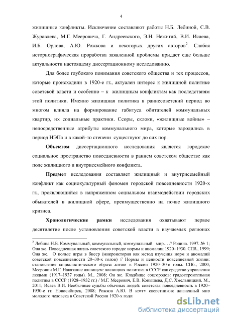 Предмет исследования составляет жилищный и внутрисемейный конфликт как социокультурный феномен городской повседневности 1920-х гг., проявляющийся в напряженном социальном взаимодействии городских обывателей в жилищной сфере, преимущественно на почве жилищного кризиса.