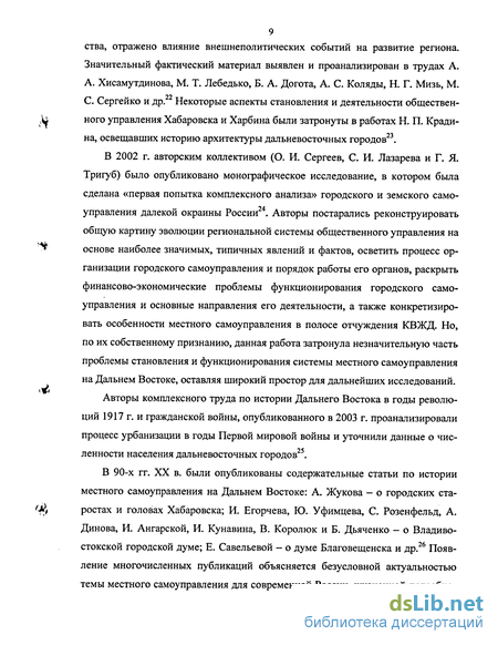 ганизации городского самоуправления и порядок работы его органов, раскрыть финансово-экономические проблемы функционирования городского самоуправления и основные направления его деятельности, а также конкретизировать особенности местного самоуправления в полосе отчуждения КВЖД. Но, по их собственному признанию, данная работа затронула незначительную часть проблемы становления и функционирования системы местного самоуправления на Дальнем Востоке, оставляя широкий простор для дальнейших исследований.