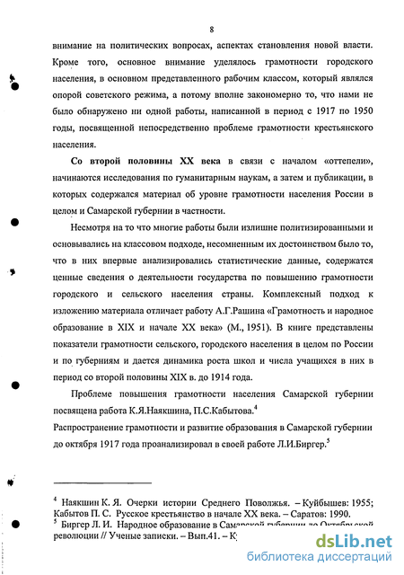 Интересные исследования, содержащие показатели уровня грамотности населения Самары и Самарской губернии, классификацию учебных заведений в нашем регионе опубликованы О.С. Струковым.6 Таким образом, во второй половине XX века появляются работы, в которых анализируются статистические данные, рассматриваются итоги культурной революции, оценивается динамика грамотности населения России на рубеже XIX-XX вв.