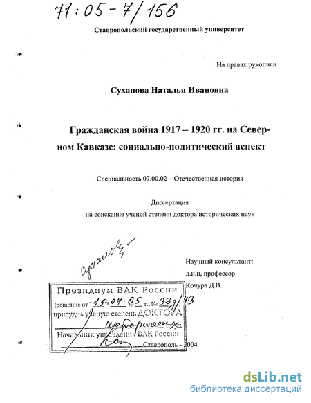 Объектом исследования является история гражданского противостояния на Северном Кавказе в 1917-1920 гг. в его социально-политическом аспекте, охватывающая период с момента его зарождения, начавшегося с кризисом самодержавной государственности, до фактической победы Красной армии в Гражданской войне в регионе.