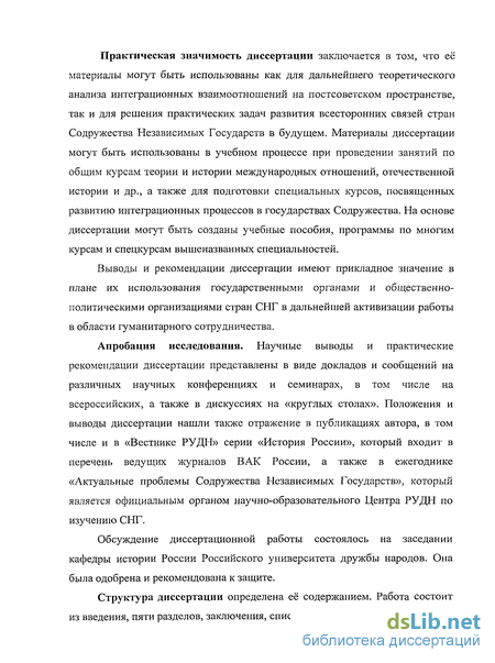 Практическая значимость диссертации заключается в том, что её материалы могут быть использованы как для дальнейшего теоретического анализа интеграционных взаимоотношений на постсоветском пространстве, так и для решения практических задач развития всесторонних связей стран Содружества Независимых Государств в будущем. Материалы диссертации могут быть использованы в учебном процессе при проведении занятий по общим курсам теории и истории международных отношений, отечественной истории и др., а также для подготовки специальных курсов, посвященных развитию интеграционных процессов в государствах Содружества. На основе диссертации могут быть созданы учебные пособия, программы по многим курсам и спецкурсам вышеназванных специальностей.
