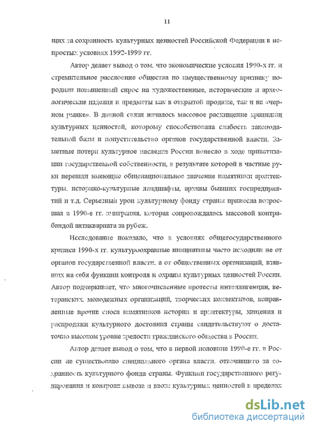 Автор делает вывод о том, что в первой половине 1990-е гг. в Рос-сии не существовало специального органа власти, отвечавшего за со-храннос гь культурного фонда страны. Фупкшіи государственного регулирования и контроля вывоза и ввозі! культурных ценностей в пределах