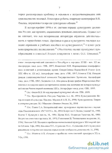 Исторї;ого*.;сЬїія исследуемой темы. Проблема охраны п сбере-жения российских культурных цешюстей в постсоветский период принадлежит- к числу наименее изученных тем отечественной ТГСТОрІЇЧ"ЄСКОЙ науки. С начала 1990-х гг. данный вопрос рассматривался препьгущест-венно в рамках социологии, культ)7ролопш? теоргпі государства и права. Прпнцтшы охраны памятішкоБ исторші и культуры тгроаналтированы в ряде работ, посвященных изучению нсторип рз'секого искусства. В публикациях нашла отражение история хранения, а иногда л уничтожения: ряда отечественных памятников барокко ті классицизма памятников древнерусского искусства. Исследователи подшшают вопрос о сохране-нип пааъ^тгогков национальной старины, но фактически обходятся вниманием роль и значение государственной политики в решении данных проблем. В статье А.П. Банникова «Проблемы охраны памятников культуры/)" отмечается необходимость охраны культурного достоятпи России. Однако автор не выходит за рамки известных законопроектов об охране пашггнпков древности.