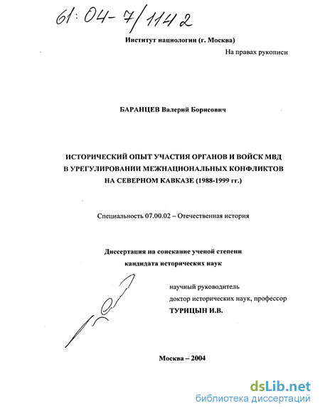 Фснухин В.И. Этнополитические конфликты в современной России: на примере Северо-Кавказского региона. Дисс. ...канд. полит наук. М., 2002; Карсанова Е.С. Регулирование этнополитических конфликтов на Северном Кавказе: Опыт и политико-правовые проблемы. Дисс. ...канд. полит, наук. М., 2003. 22 Здравомыслов А.Г. Осетино-ингушский конфликт: перспективы выхода из тупиковой ситуации. М., 1998; Искамдарян А. Чеченский кризис: провал Российской политики на Кавказе. М, 1995; Тишков В.А. Беляева К.Л. Марченко Г.В. Чеченский кризис. М., 1995; Кадыров А.А. Российско-чеченский конфликт: Генезис, сущность, пути решения. Дисс. ...канд. полит, наук. М., 2003;