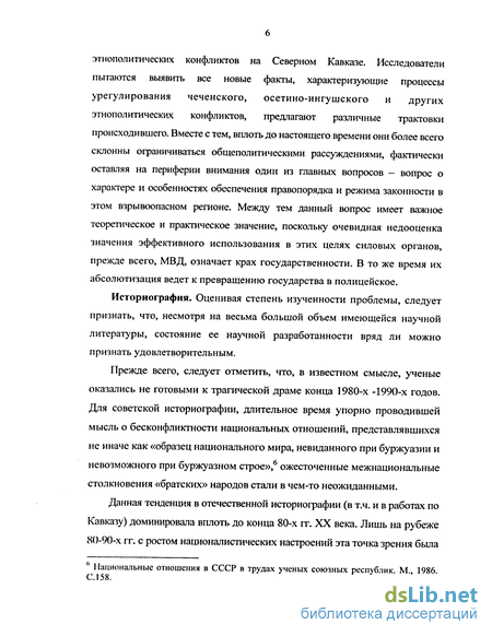 РСФСР и Российской Федерации. Вместе с тем, потребность комплексного исследования поднятой научной проблемы диктует необходимость обращения к межнациональным конфликтам на сопредельной территории Закавказья, а также внимательного анализа общероссийского материала, связанного с разработкой и реализацией общегосударственной политики в сфере регулирования межнациональных отношений и обеспечения общественного порядка и законности в стране.