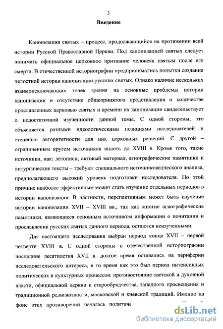 Актуальность темы. Канонизация святых - процесс, продолжающийся на протяжении всей истории Русской Православной Церкви. Под канонизацией святых следует понимать официальное церковное признание человека святым после его смерти. В отечественной историографии предпринимались попытки создания целостной истории канонизации русских святых. Однако наличие нескольких взаимоисключающих точек зрения на основные проблемы истории канонизации и отсутствие общепринятого представления о количестве прославленных церковью святых и времени их канонизации свидетельствует о недостаточной изученности данной темы. С одной стороны, это объясняется разными идеологическими позициями исследователей, оказывающих существенное влияние на методику исследования. С другой - ограниченным кругом источников, требующим специального источниковедческого анализа. По этой причине наиболее эффективным может стать изучение отдельных периодов в истории канонизации. В частности, перспективным является изучение истории канонизации XVII - XVIII вв., так как многие агиографические памятники, являющиеся основным источником информации о почитании и прославлении русских святых данного периода, остаются неизученными.